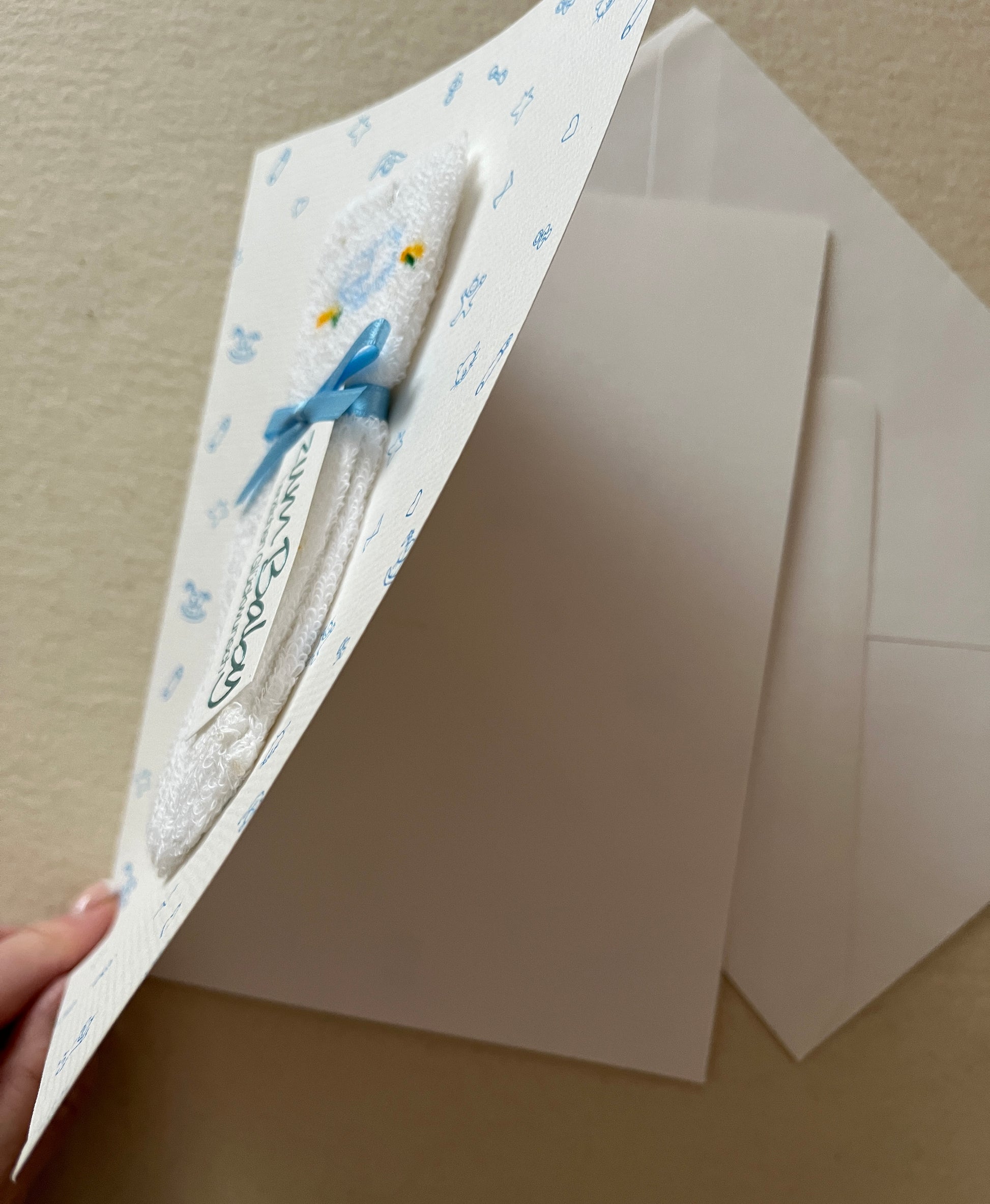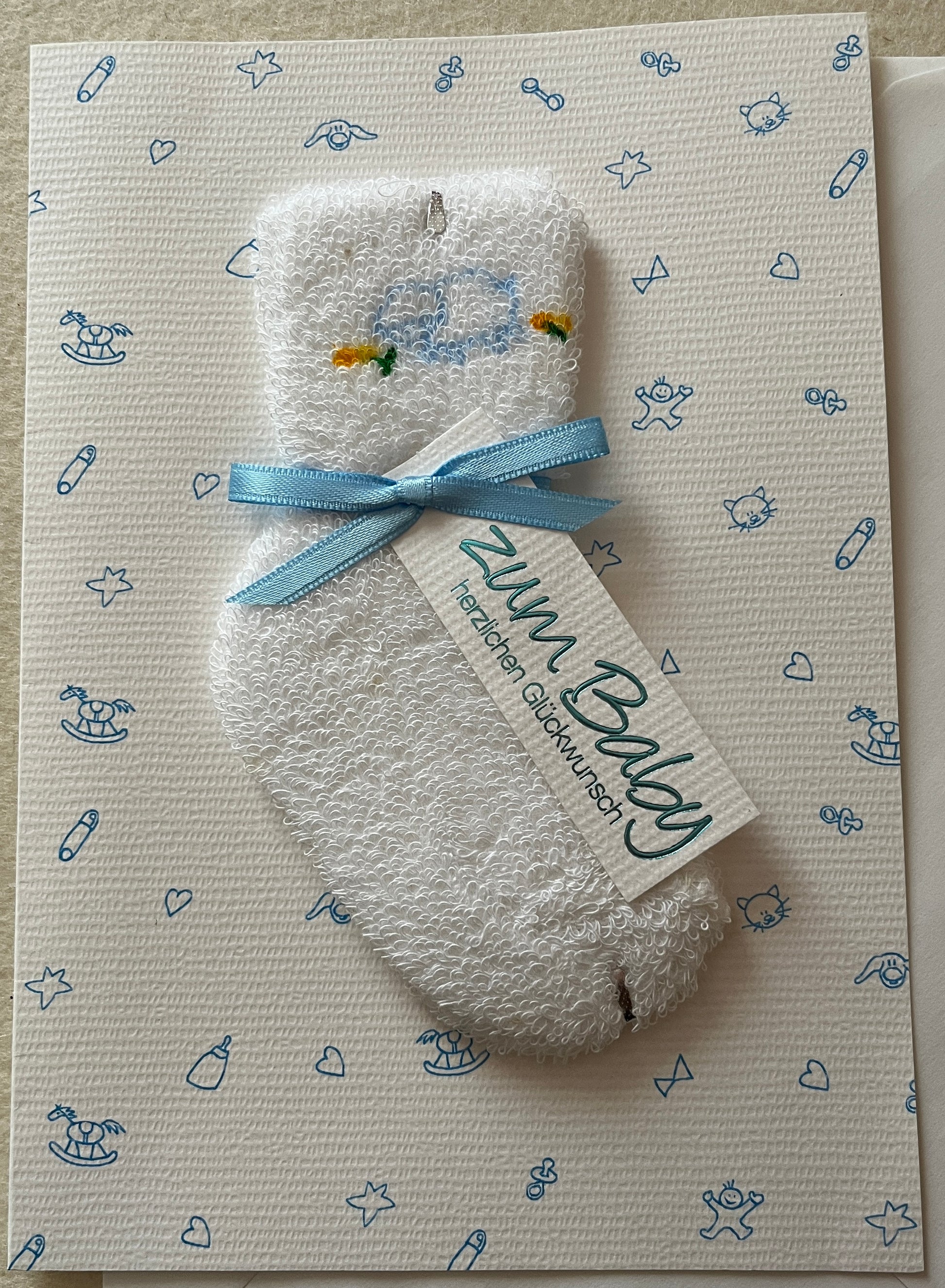 "Määh" Doppelkarte mit Babysöckchen hellblau-weiß