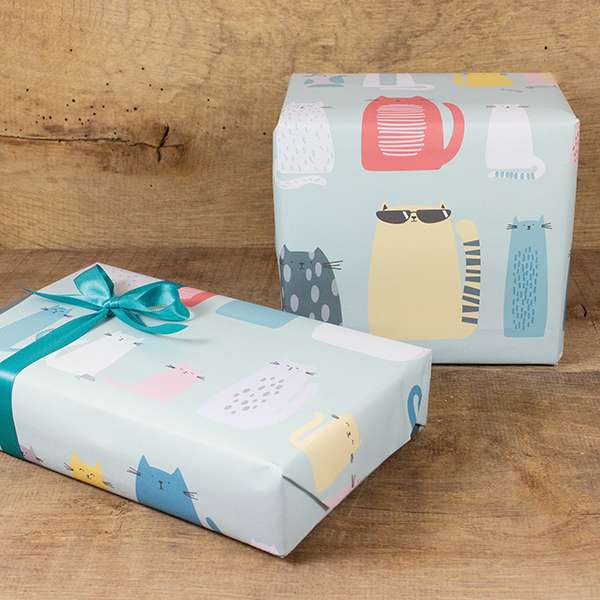 Wir haben jetzt das passende Geschenkpapier für Katzenfans! Dicke, dünne, große und kleine Vierbeiner reihen sich farbenfroh auf und verzaubern Geschenke für jedes Alter.